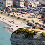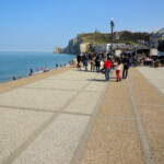 La passeggiata pedonale che costeggia tutta la spiaggia è il centro della vita di Étretat, e sono proprio i due lati estremi del lungomare a permettere l’accesso alle Falesia d’Amont (in foto) ed alla Falesia d’Aval.