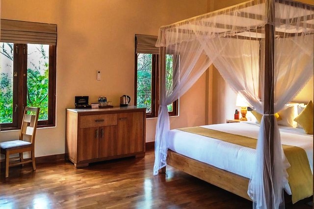 - Perché andarci: per la straordinaria ambientazione tra laghetti, stagni e ruscelli, il comfort delle accommodations, l’altissimo livello di servizio e l’ottima cucina del ristorante. Solo 30 ville, arredate magnificamente, le più semplici sono le Deluxe e misurano 88 mq, se hai bisogno di maggior spazio prenota le Superior Deluxe with Plunge Pool, sono le più gettonate. Offre due ristoranti, un bar, una grande infinity pool dove puoi nuotare, Spa, massaggi ayurveda, yoga classes e palestra. La proprietà è immensa e per spostarsi si utilizzano piccole golf cart elettriche, nel giardino incontri pavoni, rapaci e varani, e negli immediati dintorni è facile osservare elefanti e coccodrilli. Ad oggi ed in assoluto il miglior albergo di lusso dove alloggiare a Sigiriya.