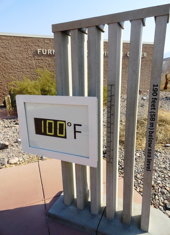 - Sotto una foto da me scattata in agosto alle ore 15 al Furnace Creek Visitor Center situato a meno 58 metri sotto il livello del mare. La temperatura segna esattamente 100 gradi Fahrenheit, quasi 38 gradi Celsius, un valore assolutamente non eccezionale per la Death Valley, si può dire facesse quasi fresco…